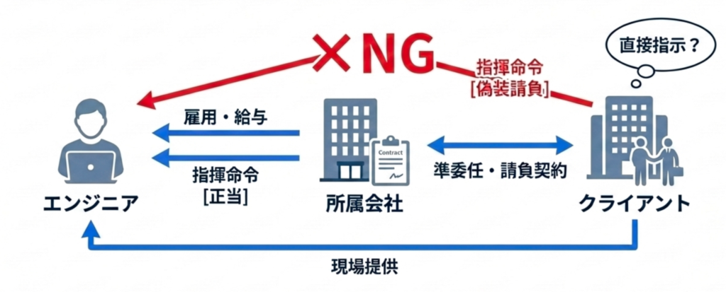 表の中でとくに把握しておきたいのが「指揮命令権」の行です。客先常駐(SES)と請負では指揮命令権が所属会社にありますが、派遣は派遣先にあります。日々の業務で誰の指示に従うかが法的に異なるため、自分の契約内容は入社前に確認しておきましょう。