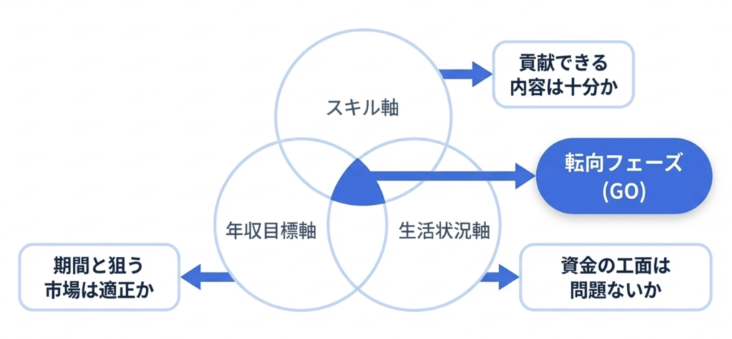 - 転向フェーズ:軸1の○が2つ以上 + 軸2の目標が明確 + 軸3の懸念が少ない → 3ヶ月ロードマップへ進む