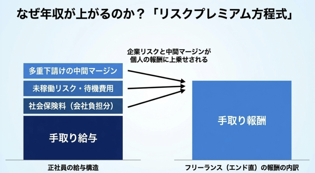 これは商流(下請け構造)だけで説明できる話ではありません。実際に、商流を挿みつつ高単価を得ているフリーランスも普通に存在します。年収が上がる本質的な理由は、「安定を手放す代わりに、その分が単価に乗る」という構造です。