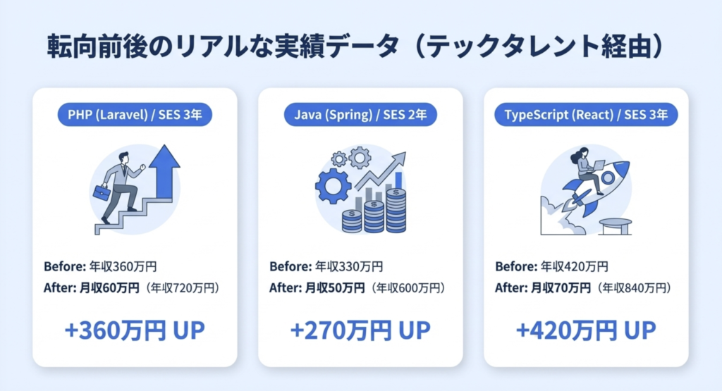年収増の幅はスキルと経験年数に比例しますが、いずれのケースも「リスクを引き受けた分が単価に反映された」ことが年収増の主因になっています。